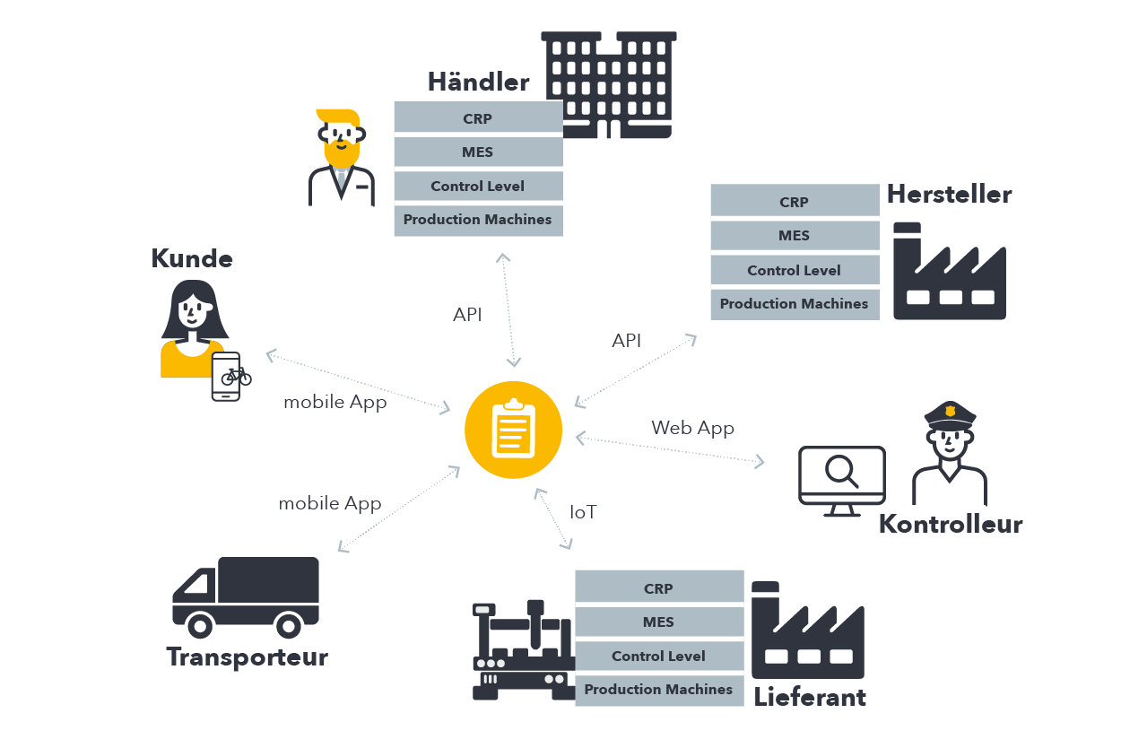- Automatisierte und fälschungssichere Rückverfolgung von Bestellungen, nach deren Eingang automatisch Produktionsprozesse angestoßen werden